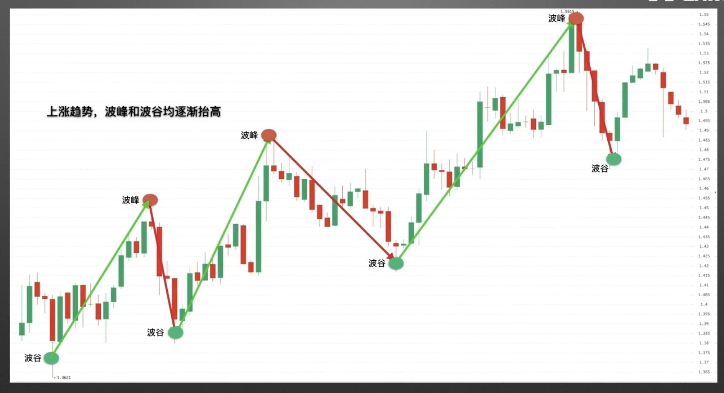 图为上涨趋势,我们可以明显的看到,在上涨趋势中波峰和波谷均表现出逐渐抬高的特点。