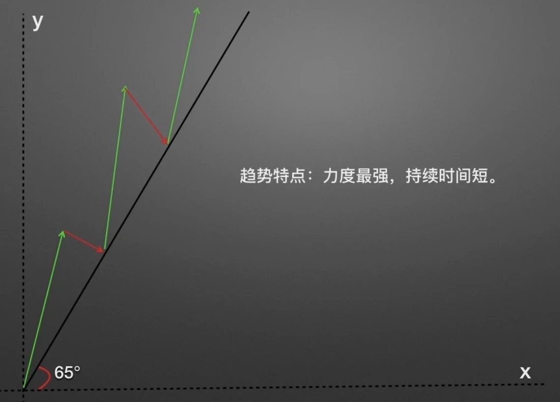 当趋势倾角由45度演变成65度时,我们看到上涨力度变的更强,但构成趋势的K线数量明显少于45度趋势线,也就是说倾角过陡的趋势线,虽然力度相对增强了,但持续时间相较会缩短。这样的趋势在变盘时,同样会表现的有力且急促,因此,切忌追涨杀跌。