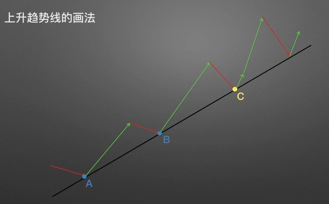 如图将A、B两个波谷进行连线得到一条斜向上的直线,(技术分析称之为上升趋势线。)仅仅两个波谷不足以证实趋势线的有效性。还需得到第三个波谷C的确认。