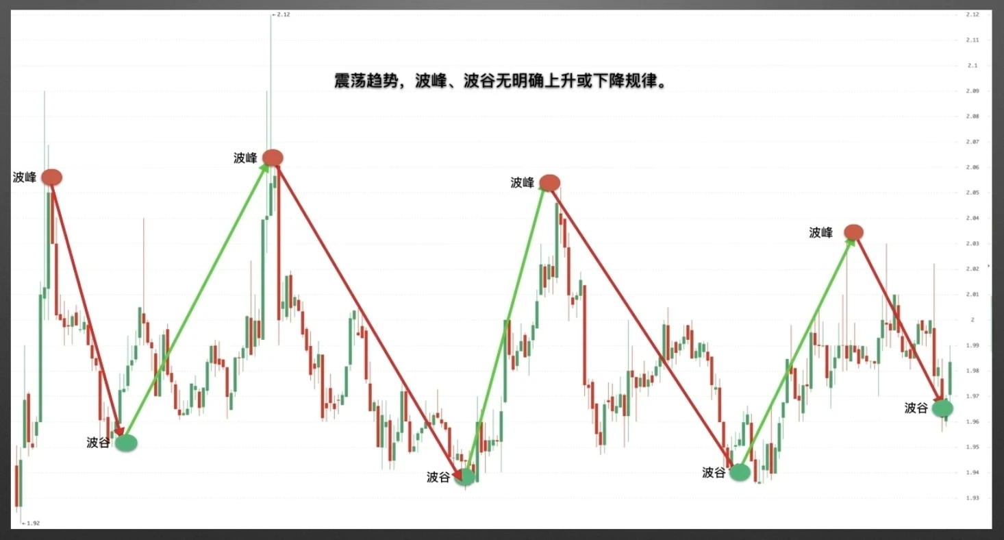 图为常见的震荡趋势,上面的波峰没有表现出规律性的抬高;下面的波谷也没有表现出规律性的下降。因此,震荡趋势的特点是波峰、波谷无明确上升或下降的规律,特殊形态下,波峰或波谷会处于同一水平线上。该形态后续给大家分享。