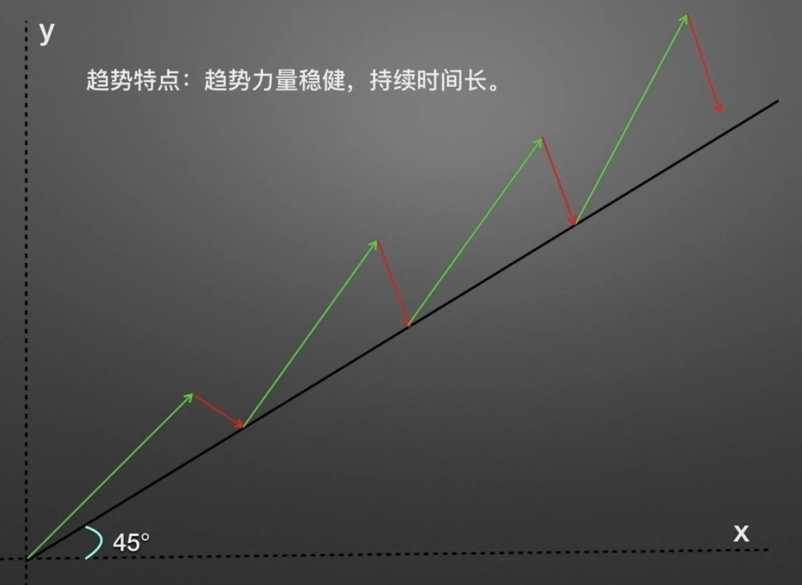 图为45度倾角的上升趋势线简化图,该趋势上涨稳健有力,实际走势中构成的K线数量较多,因此45度倾角的趋势,持续时间更久。