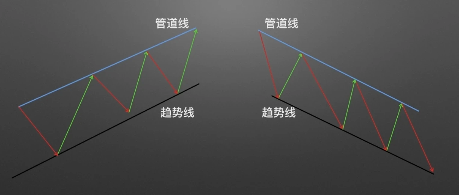 如图所示,下方黑色直线为前面讲过的趋势线;上方蓝色直线为管道线。左边为上升通道简化图,右边为下降通道简化图。