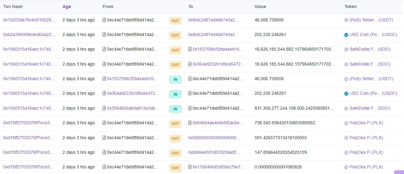 首先是SafeDollar。6 月 28 日,有媒体报道称,Polygon 生态算法稳定币项目 SafeDollar 遭受黑客不明攻击,该项目所发行的稳定币 SDO 在当天从 1.07 美元的价格瞬间跌至归零。据 Rugdoc.io 分析,黑客从攻击中拿走了价值 25 万美元的 USD 和 USDT。随后,SafeDollar项目方发布公告,要求投资者停止所有与SDO相关的交易。目前,SDO交易已暂时中止。