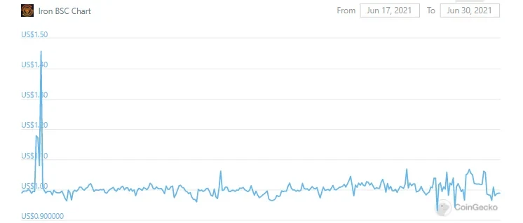 受到这一事件的影响,稳定币Iron在当天的最大振幅接近50%,大量投资者集中赎回Iron的操作使得其价格一度逼近1.5美元,远远偏离预期锚定的1美元,不过很快Iron的价格又恢复到1美元上下的水平。