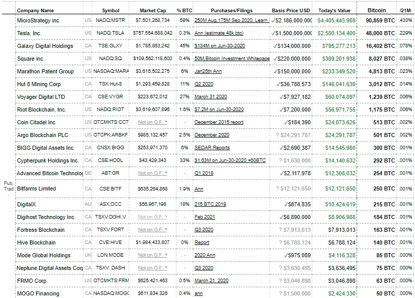 确实,据bitcointreasuries.org数据显示,目前有42家公司持有超135万枚比特币,占2100万比特币总供应量的6.43%,总价值逾650亿美元。最大的持有者是灰度,其拥有64.91万枚比特币。表内还列出了22家持有比特币的上市公司,其中MicroStrategy和特斯拉以9.08万枚和4.80万枚比特币持有量位居一二。