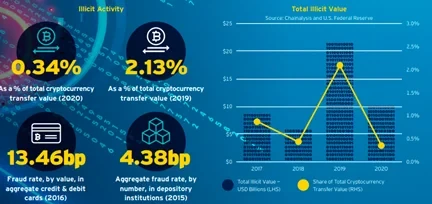 虽然加密货币的安全问题时有发生,但与传统支付相比,它表现得更好些。花旗引用的Chainalysis和美联储数据显示,2020年犯罪活动占加密货币总交易量的0.34%,低于2019年的2.1%,可见比特币被认为是非法活动的主要渠道是一种明显的误解。