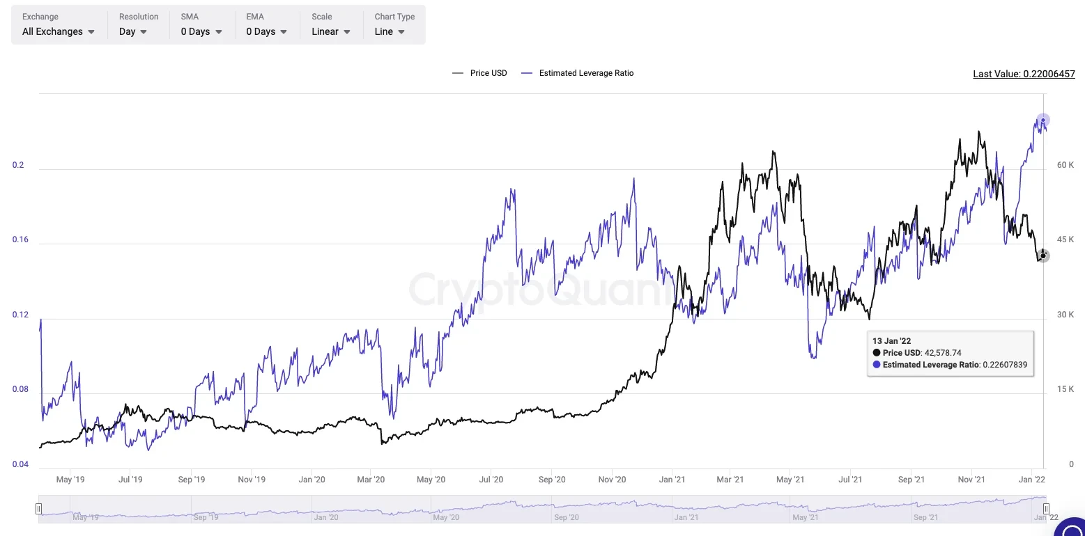 根据CryptoQuant数据,截止1月20日,比特币预估杠杆率达到了0.224,创历史新高。较高的比率,表明更多的投资者正在承担高杠杆风险。