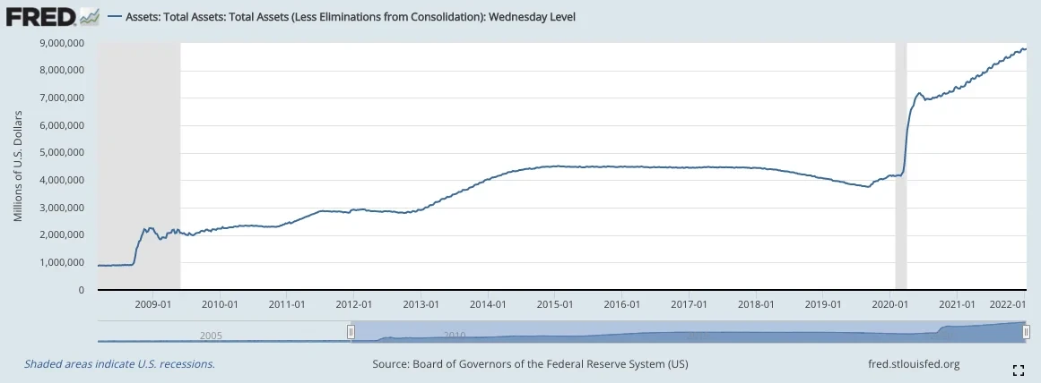 2008年金融危机之后,美联储开启三轮QE,资产负债表从0.9万亿增长到4.5万亿,用时6年。而新冠期间的无限量化宽松,美联储资产负债表短短两年就从4.5万亿推升至9万亿附近,用时仅2年。