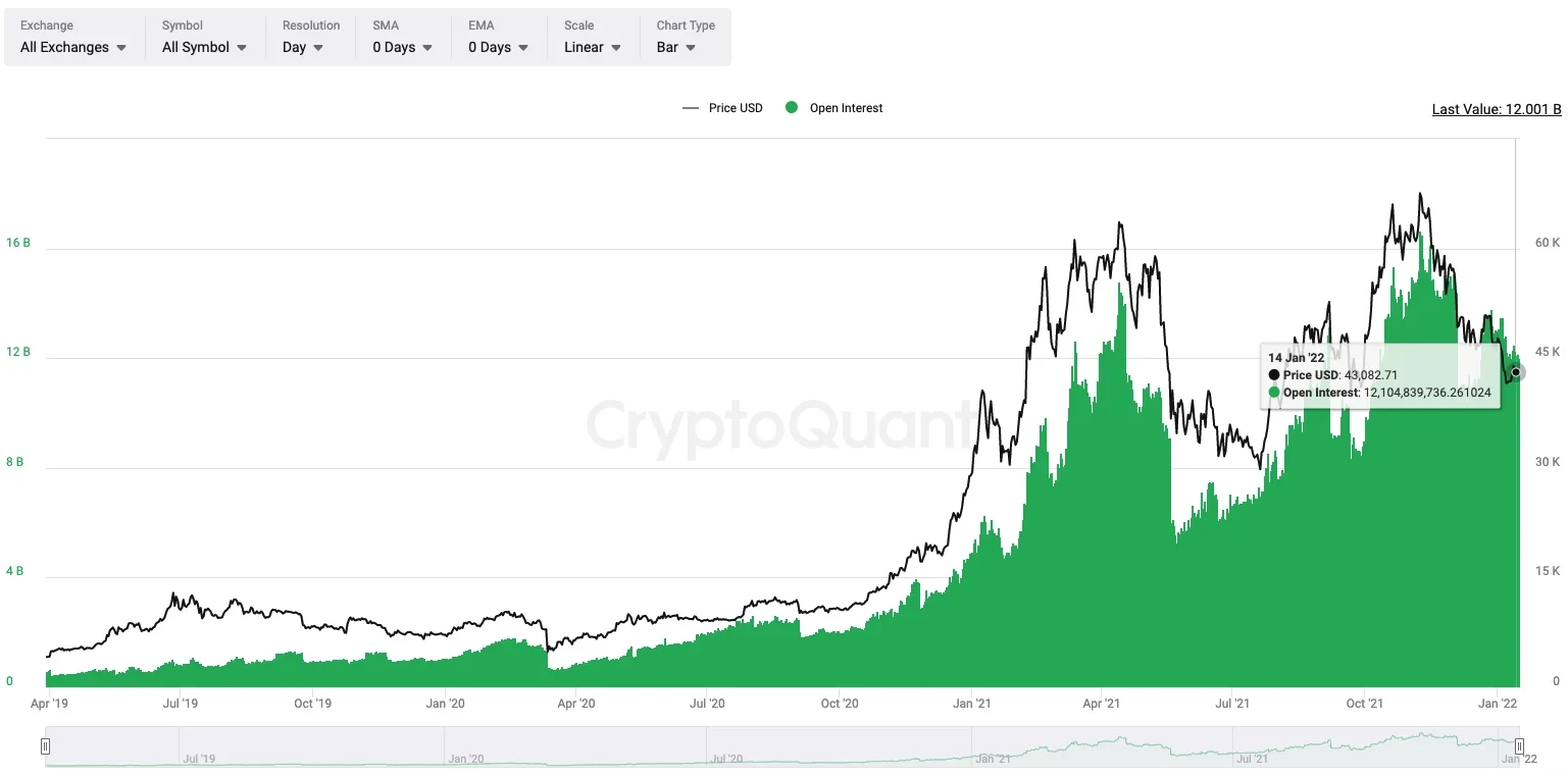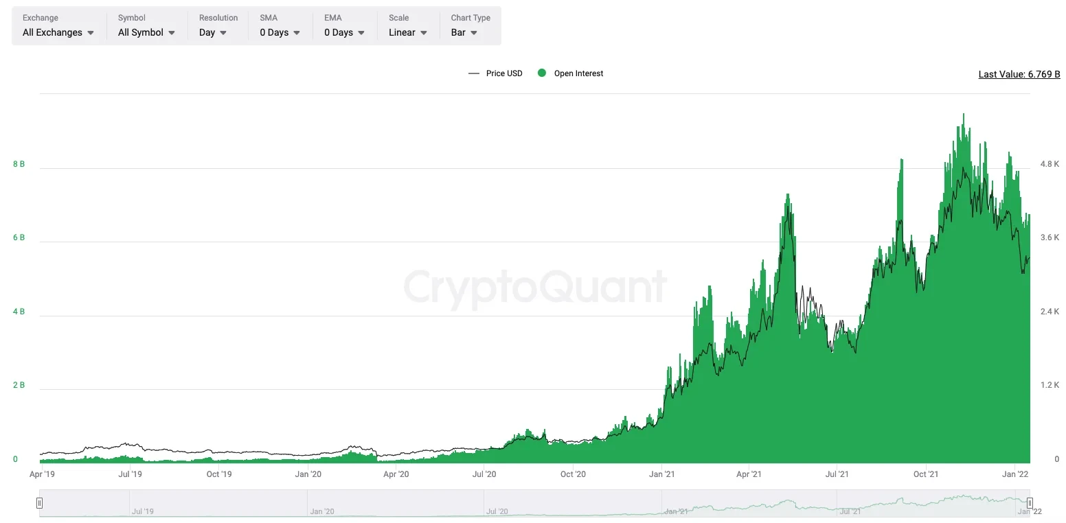 根据CryptoQuant统计数据,目前交易所比特币未平仓合约总价值120亿美金,以太坊未平仓合约总价值68亿美元,两者均处于历史高位。