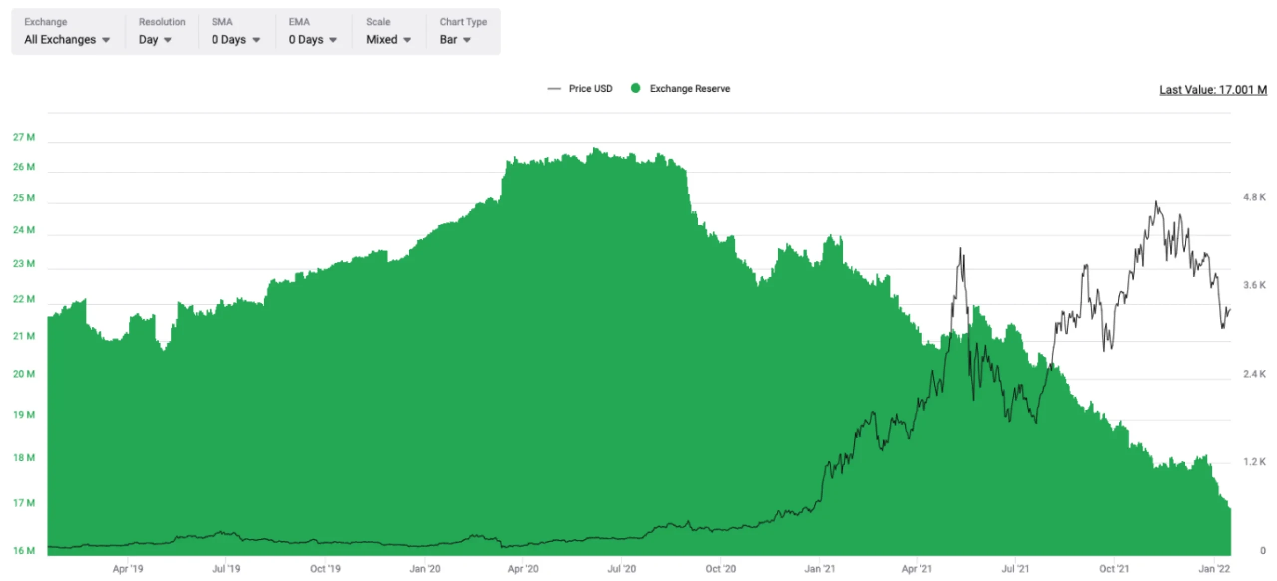 交易所保有的以太坊数量为1700万个。