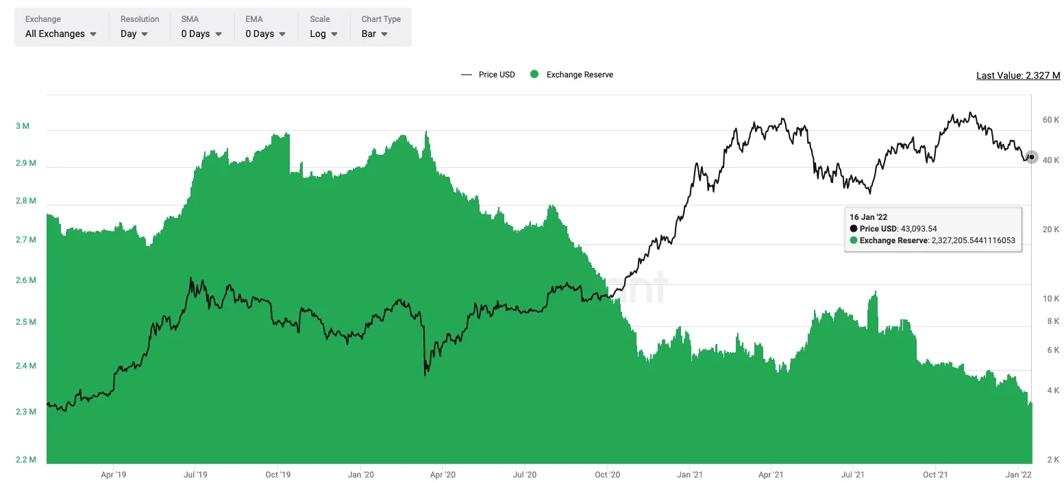首先,自2017年以来,交易所保有的比特币以太坊数量不断下降,均已创阶段新低。目前,交易所保有比特币数量为232万个。