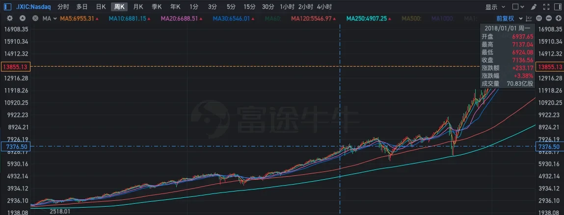 在此期间,美国股市依然强势上涨,例如,纳指从3100点上涨至7100点。