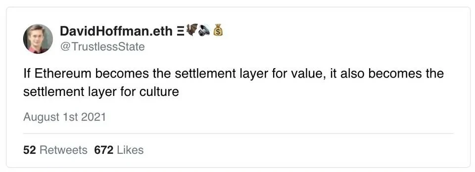 此前,Bankless联合创始人David Hoffman曾提出,如果以太坊可以成为价值结算层,就也能成为文化结算层。可谓文武双全。现在看来,以太坊正朝着这个方向前进。