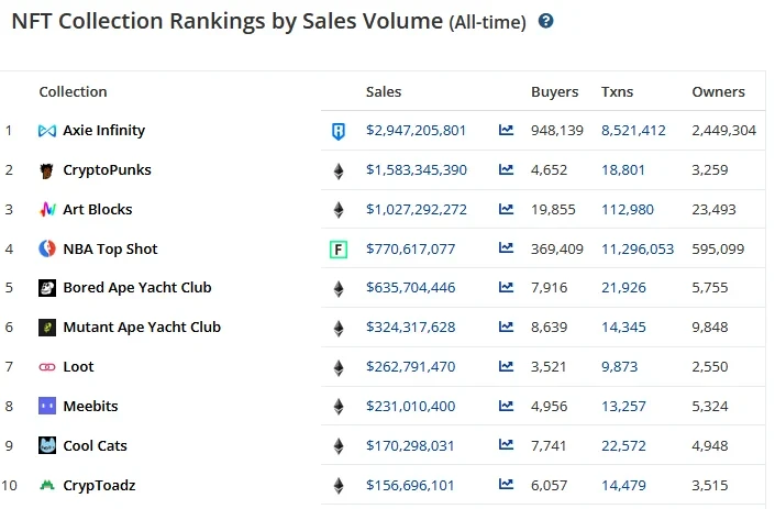 根据cryptoslam.io最新数据,Art Blocks是最大的生成艺术品交易平台,历史成交额已超过10亿美金,成交额仅次于Axie Infinity与Crypto Punks,位于第三位,足以说明生成艺术在NFT领域的受欢迎程度。