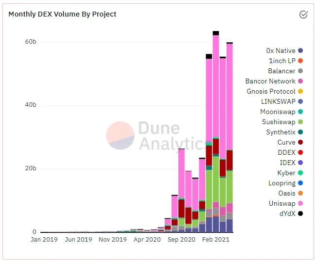 比如以月度为单位来审视DEX的交易量变化,可以发现在2019年初,不仅DEX数量少的可怜(仅有UniSwap、Kyber、IDEX三家),交易量更是只有不到4000万美元的规模,而到了2021年2月,DEX月度交易量一度超过600亿美元,进入2021年以来呈现爆发式增长趋势。