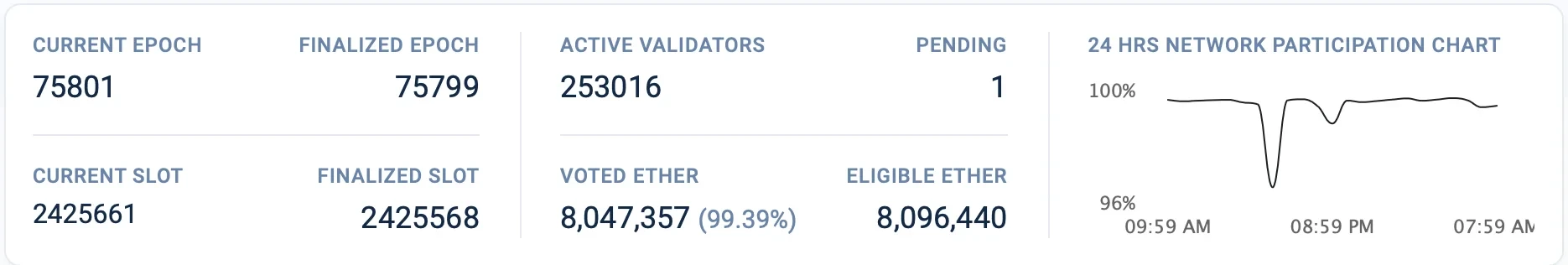 自2020年12月信标链上线以来,以太坊开始正式向权益证明(PoS) 过渡。这个新的PoS系统是以太坊2.0整体网络升级的一部分,目前正在顺利运行。截至11月3日,信标链上有超过25万的活跃验证者,总共注入了804万ETH到以太坊2.0之中,近一个月网络参与率维持在96%以上。