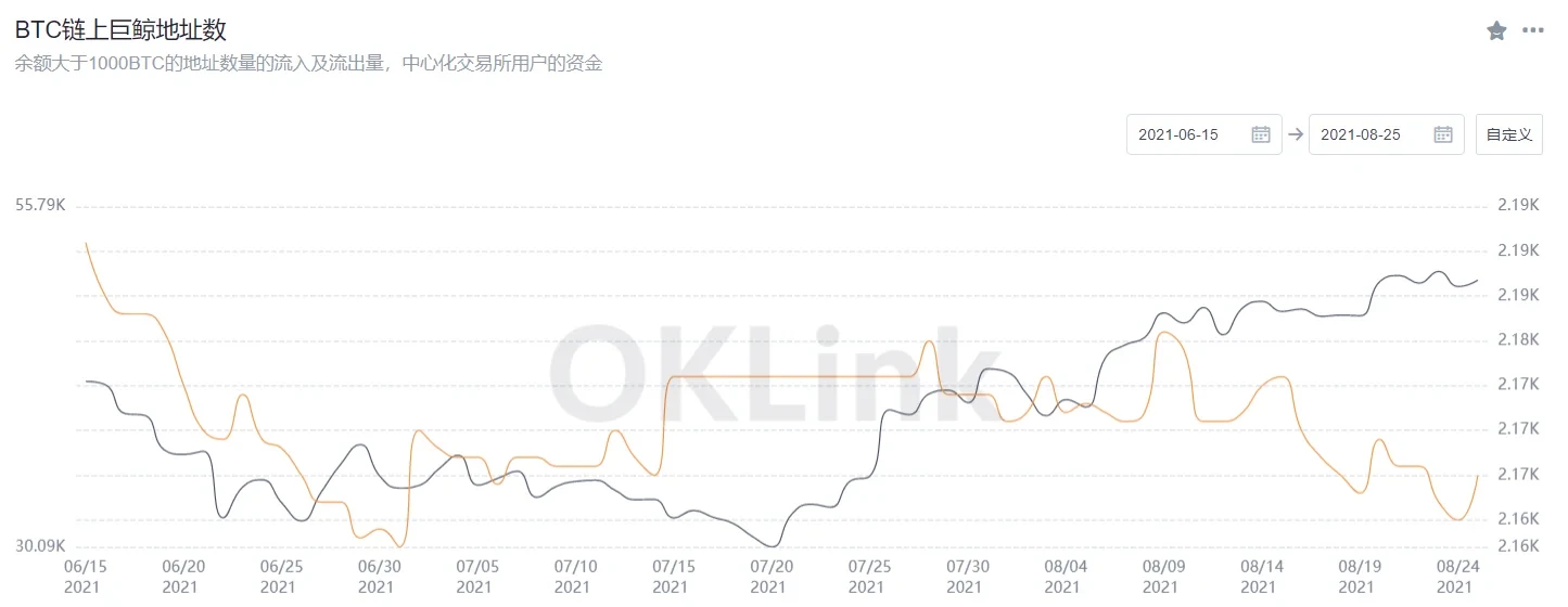 OKLink数据显示,近两日,持币余额大于1,000枚比特币的巨鲸地址数也在增加,从8月24日的2,160个,上升至8月25日的2,165个。巨鲸增持也被认为是持有大资金的各方对比特币后市的看好,是比特币看涨的一个关键指标。