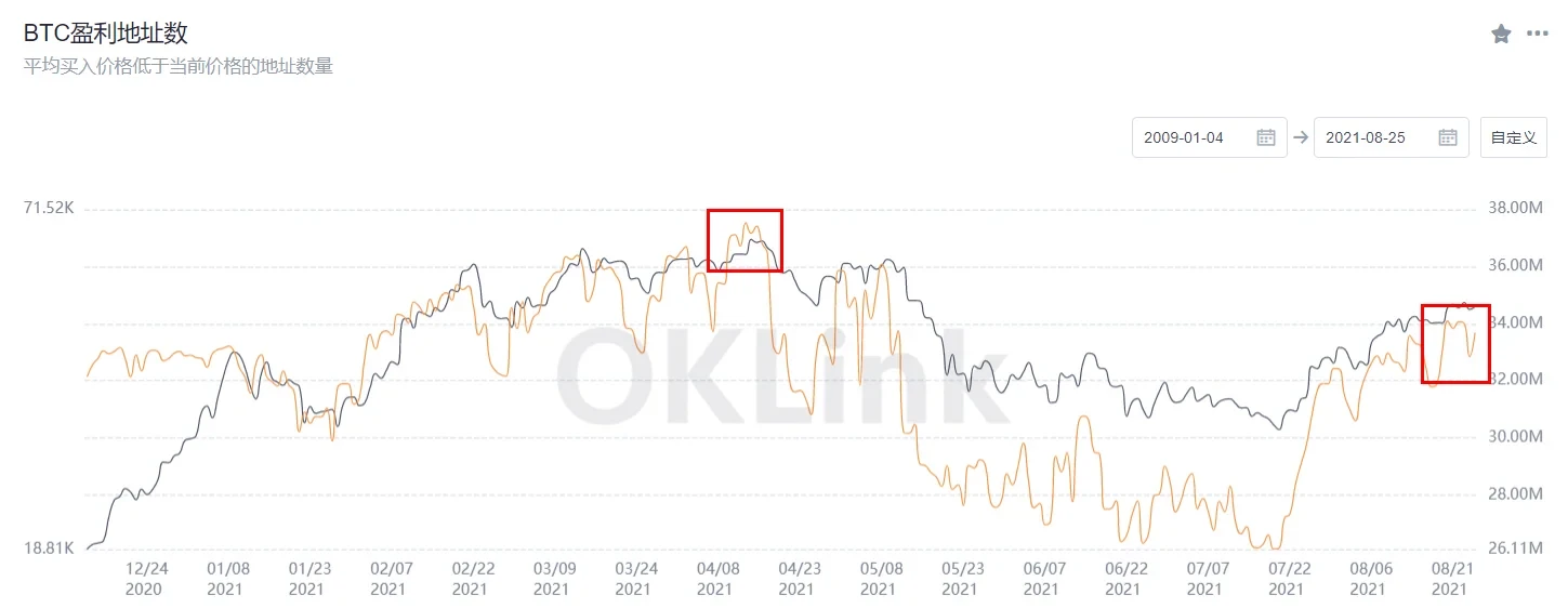 此外,在此轮连续5周的上涨中,比特币的盈利地址数从7月21日的2,614.37万个,上涨至8月23日的3,401.19万个,增幅达到了30%。而年内高点是在4月13日创下的,为3,753.04万个。