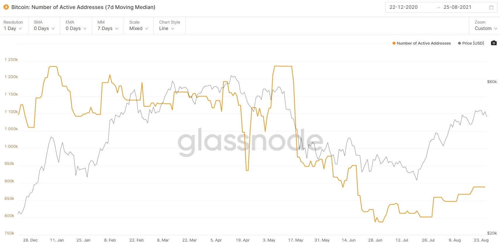 链上数据来看,比特币活跃地址数与前低(7月1日,787,767)相比,近期上升到了888,598个,增加了100,831个,但与年内高点1,236,396相比,减少了28%。