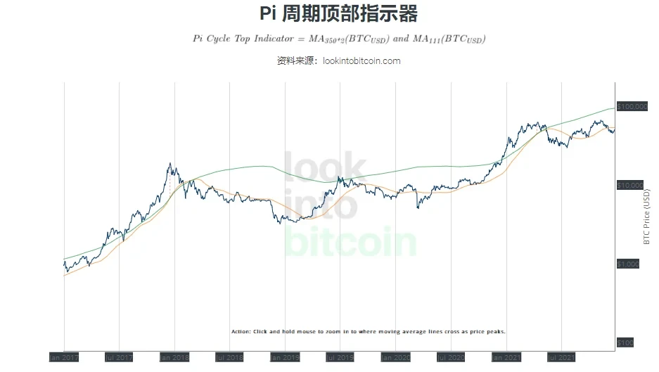 9.Pi指标:未相交,如下图:(111DMA 向上移动并穿过 350DMA x 2 时即为周期顶部。)