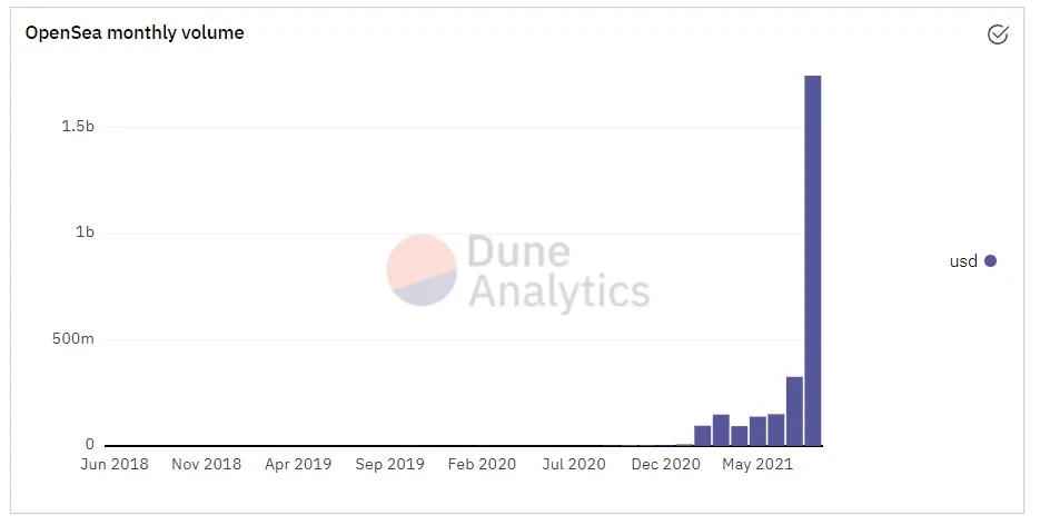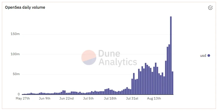 Dune Analytics数据显示,OpenSea的日交易量已经连续3日突破1亿美元,并于8月23日创下1.95亿美元的历史新高。