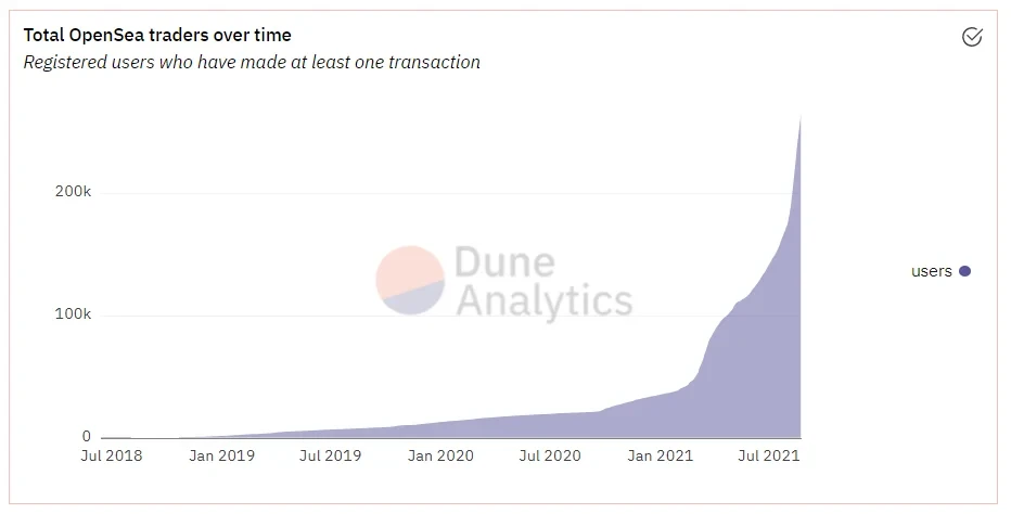 当前,OpenSea的总用户地址数已经突破25万了,相较于年初上涨了608%。