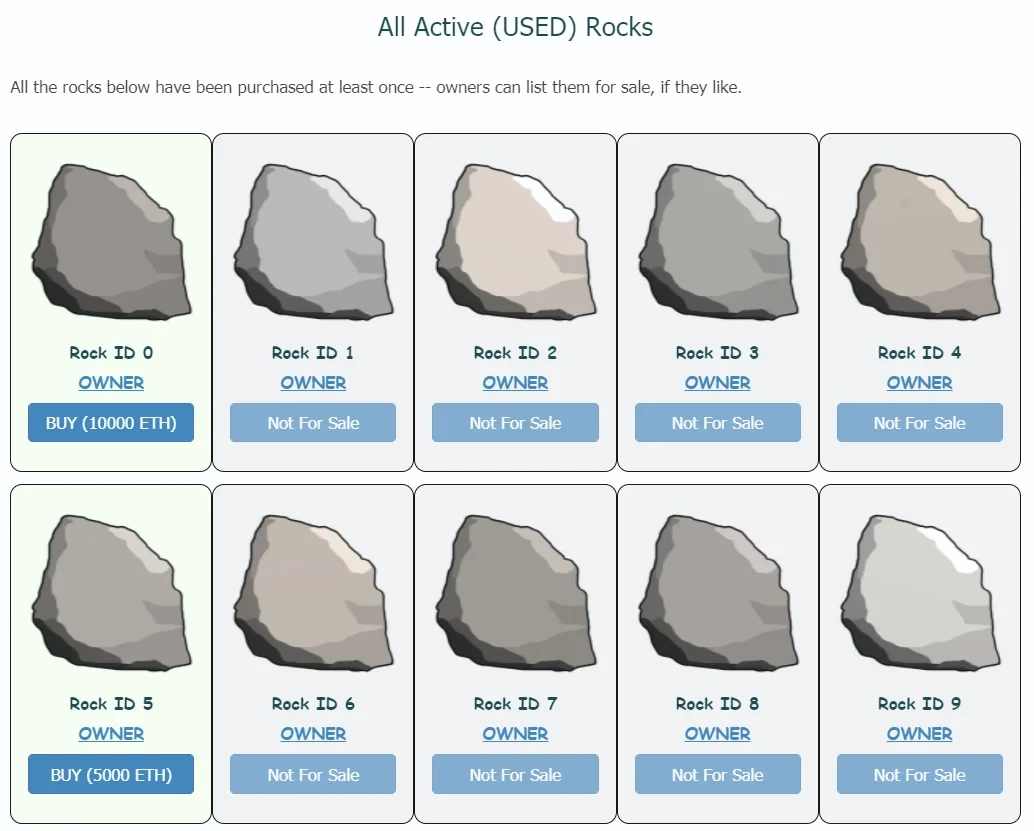 除了CryptoPunks,近期EtherRocks的表现也引起了加密市场的注意。EtherRocks是继CryptoPunks之后,首批在以太坊区块链发行的加密收藏品之一,每个EtherRock都展示了一块石头的静态图像,每块石头都涂上了独特的颜色,但形状和大小却完全相同。EtherRock的总量为100个,第一个EtherRock在2017年12月26日以0.099 ETH(当时约合75美元)的价格出售。