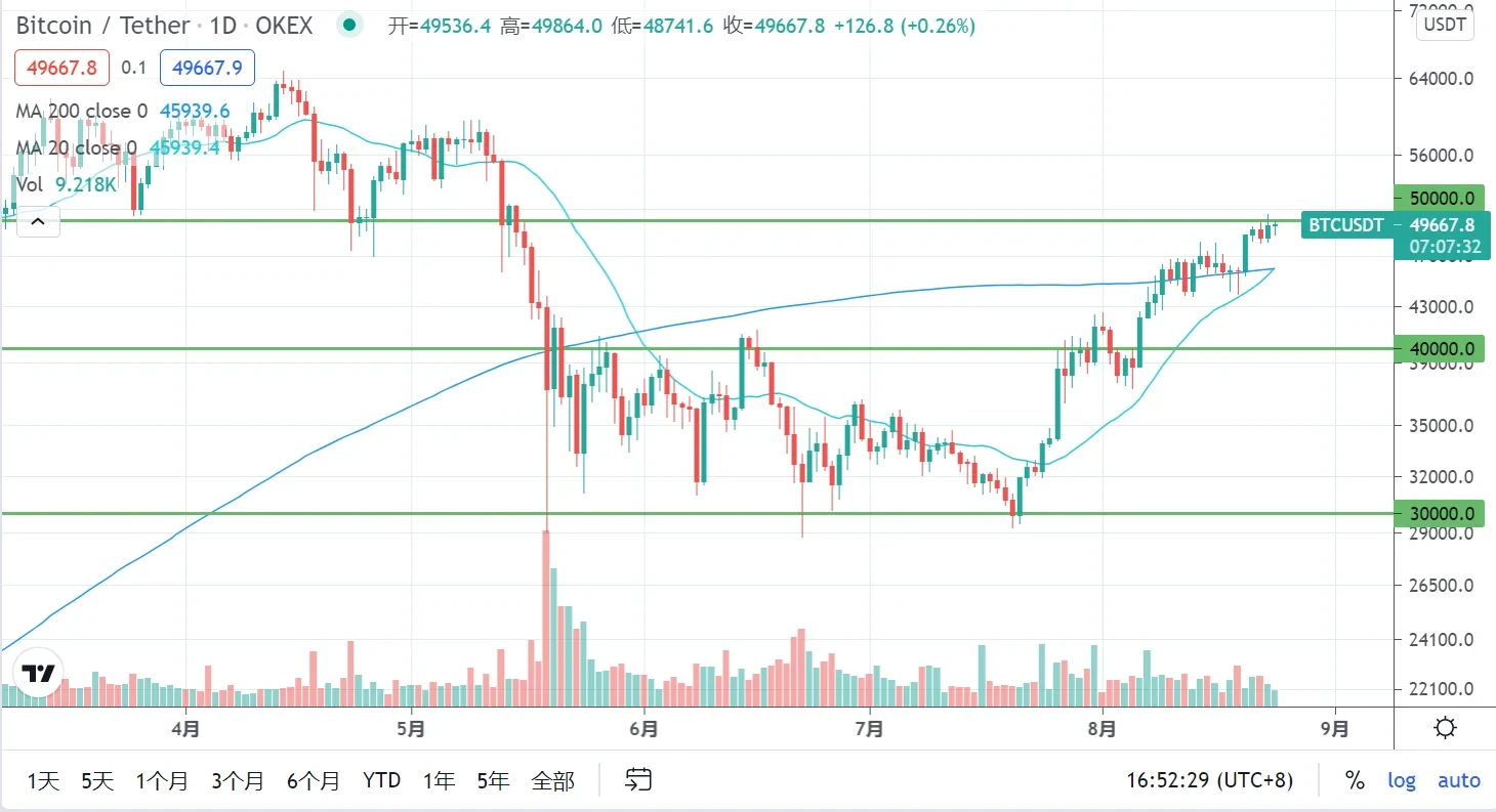 此前市场一直密切关注着比特币的走势,作为加密世界的风向标,比特币在经历了5月中旬的接连下挫后,从55,667美元开始,最低跌至28,808美元,此后进入3万-4万美元的震荡区间,在3次跌破3万美元被有效拉回后,于7月21日比特币开启了连续5周的上行趋势,并在8月23日上破5万美元。