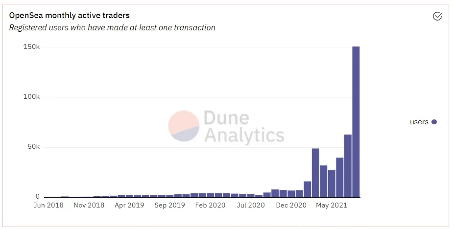 不过从融资情况来看,OpenSea在7月20日刚宣布完成了1亿美元的B轮融资,此轮由a16z领投,Mark Cuban等一众天使投资人也参与了本轮投资,本轮融资后,OpenSea的投后估值达到了15亿美元。而在2021年3月,OpenSea则是完成了2,300万美元的A轮融资,同样由a16z领投。可以看出,其融资多数为股权融资,暂未看到明显的发币计划。但尽管是这样,也引发了一轮加密圈前往OpenSea的交互热潮。