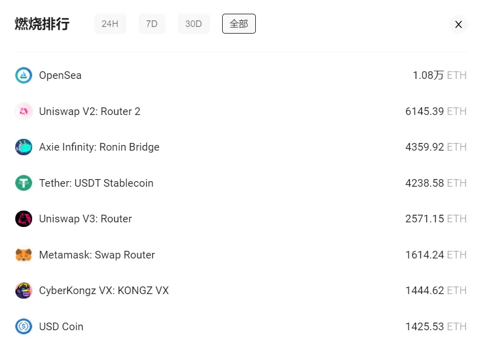 NFT在2021年的突破,CryptoPunks、EtherRocks、Axie Infinity等的热炒,造就了OpenSea的繁荣。在以太坊的Gas燃烧排行榜上,OpenSea以燃烧1.08万ETH稳居榜首,第二名是DeFi的DEX龙头Uniswap。
