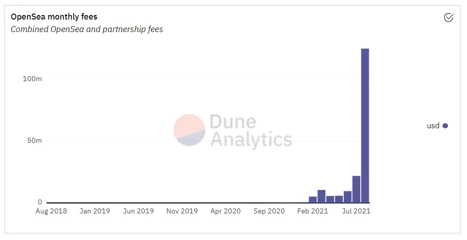 因为OpenSea的收入模式主要以交易手续费为主,所以可以看出,其收入也与交易量呈正相关。截至8月24日,OpenSea的总收入已经超过了1.25亿美元。据统计,OpenSea第一季度的总收入为1,623万美元,第二季度的总收入为2,096万美元,7月份的总收入为2,186万美元,7月份的总收入已经超过了第二季度的总和,而尚未过完的8月,则是超过了前7个月的总和,足以可见NFT的热度之高。