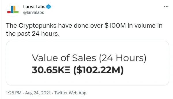 受Visa入局影响,CryptoPunks的开发团队Larva Labs发推称,CryptoPunks过去24小时的交易量突破1亿美元,目前即使是最便宜的一只Punk,开价也达到了73.44 ETH,即24.47万美元。