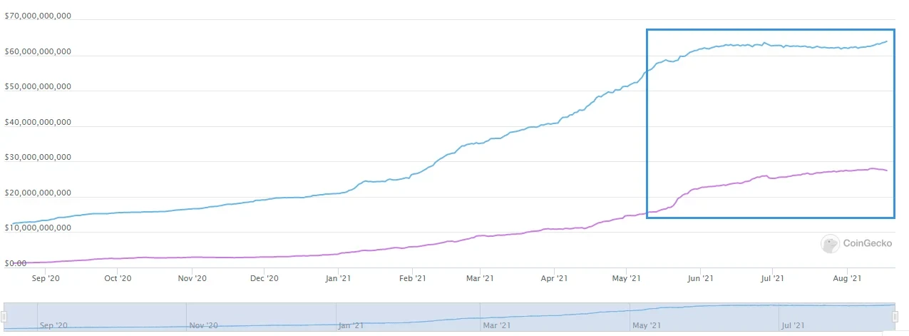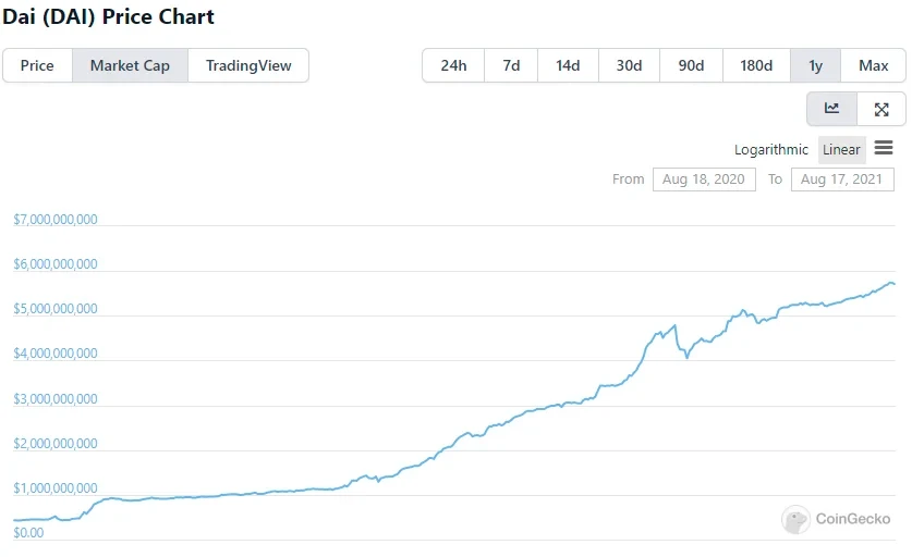 最后来看加密资产抵押类稳定币的代表Dai。据coingecko数据显示,Dai当前流通总市值为57.06亿美元,相比年初11.67亿美元的规模,涨幅超过388.94%。具体到近三个月来看,也呈现比较明显的上涨态势,流通市值从5月份的40.51亿美元扩张至57.06亿美元,增长接近41%。