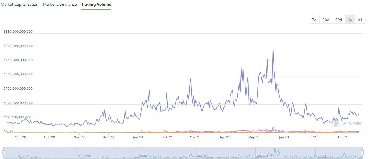 简单总结一下,就上述选定的抵押类稳定币在近几个月的表现来看,其总计市值已经达到938.83亿美元,除了Dai和USDC的市值规模在近几个月有明显上升之外,其余基本处于停滞或下降状态。而从交易量维度看,以上稳定币的数据均有较大幅度下滑,以coingecko统计的USDT的交易量为例,本月17日的交易量仅有692.59亿美元,不仅远低于年内2953.73亿美元的高峰值,甚至回到了2020年底的水平。