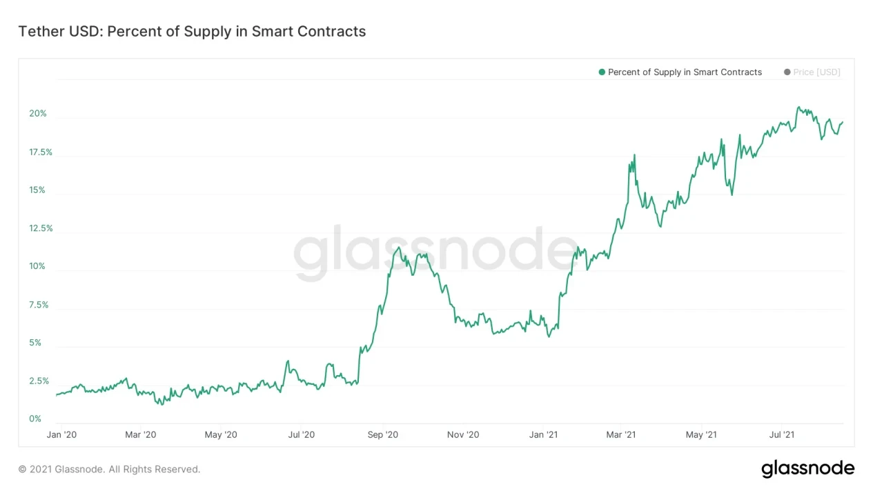 另一方面,随着DeFi的飞速发展,流动性挖矿相对安全稳定的收益方式,吸引了越来越多的稳定币流入各式各样的DeFi协议之中,据glassnode统计,目前在智能合约中锁定的稳定币已经占到了稳定币总流通量的19.74%。