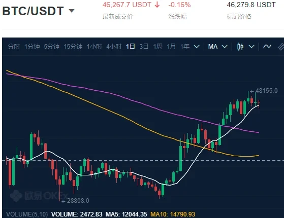 自从比特币价格在7月下旬再次在3万美元关口获得支撑后,在此后近一个月的时间里一路上涨至4.8万美元附近,涨幅高达60%,据欧易OKX行情显示,近两日比特币价格有所回落,目前暂报46200美元左右。