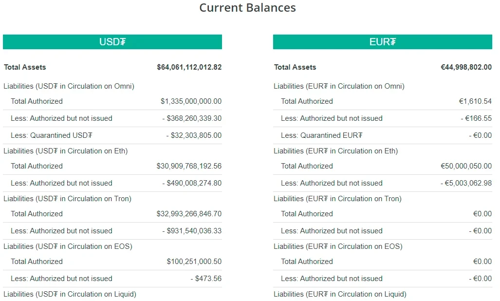 据Tether官网信息显示,目前USDT总市值为640.6亿美元(含已授权未发行部分),实际流通市值为638.98亿美元;同时还可以看到Tether发行了锚定欧元的稳定币EURT,目前流通市值大约为4499.88万欧元(约合5264.86万美元),在此不妨一并计入在内。