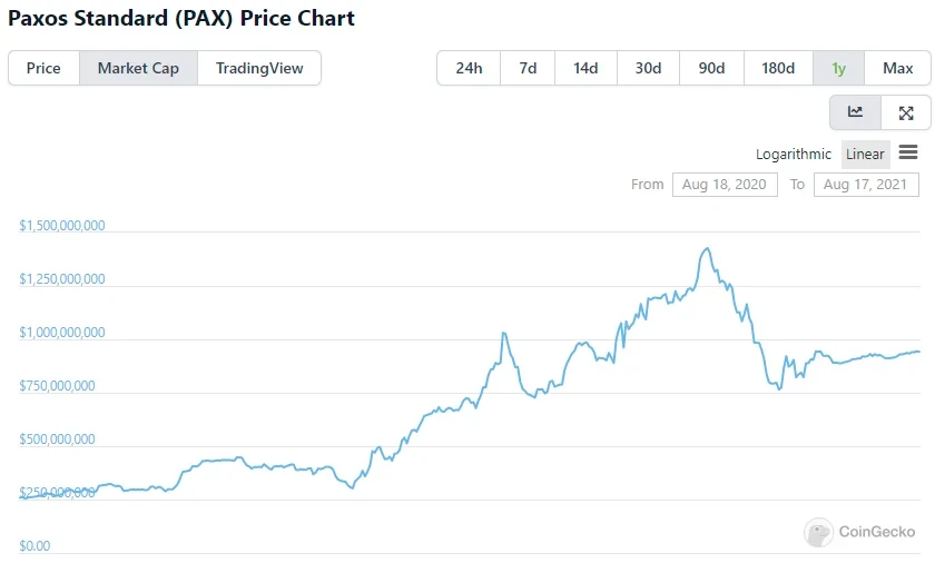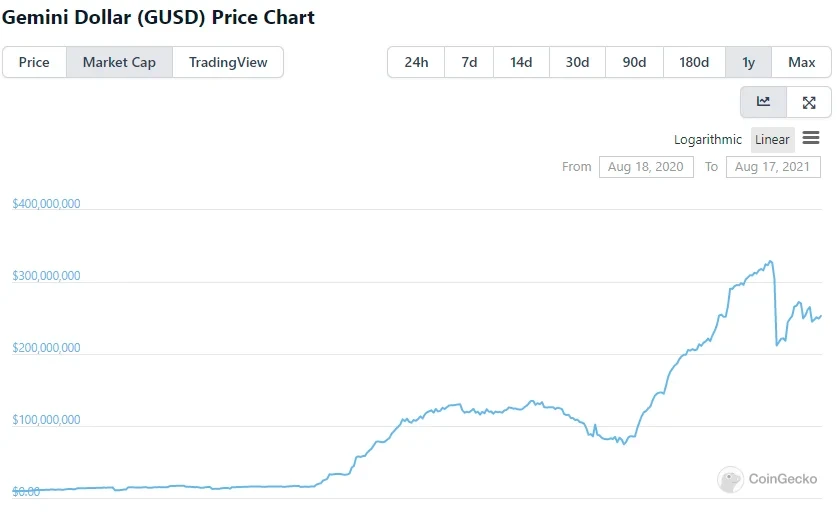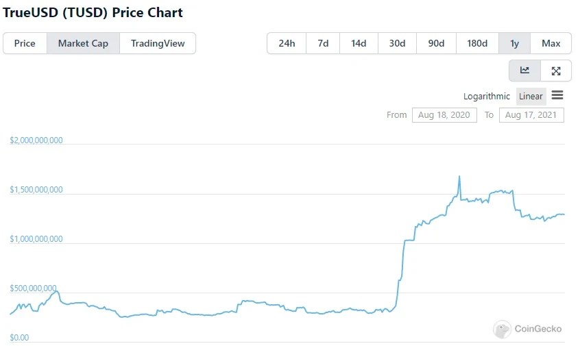 在法币抵押类稳定币中,除了上面的两大巨头,其余的诸如TUSD、PAX、GUSD等虽然市值总量相对不大,但依然呈现出不错的上涨势头。从coingecko的统计数据可以看到,目前TUSD的流通市值为12.97亿美元,相比年内低点(2021年1月11日)3.02亿美元,涨幅达到329.47%。不过就最近三个月的情况来看,TUSD的总市值出现了较大的缩水情况,从最高点16.8亿美元最低降至12.34亿美元。