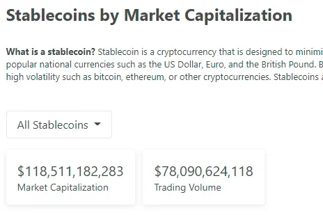 首先来了解一下稳定币市场的概况,据coingecko统计,目前市场中的稳定币共有59种,其中近半数以锚定美元价格为目标,USDT和USDC稳居前两位。当前稳定币市场总市值1185.11亿美元,占加密市场总市值的5.93%。