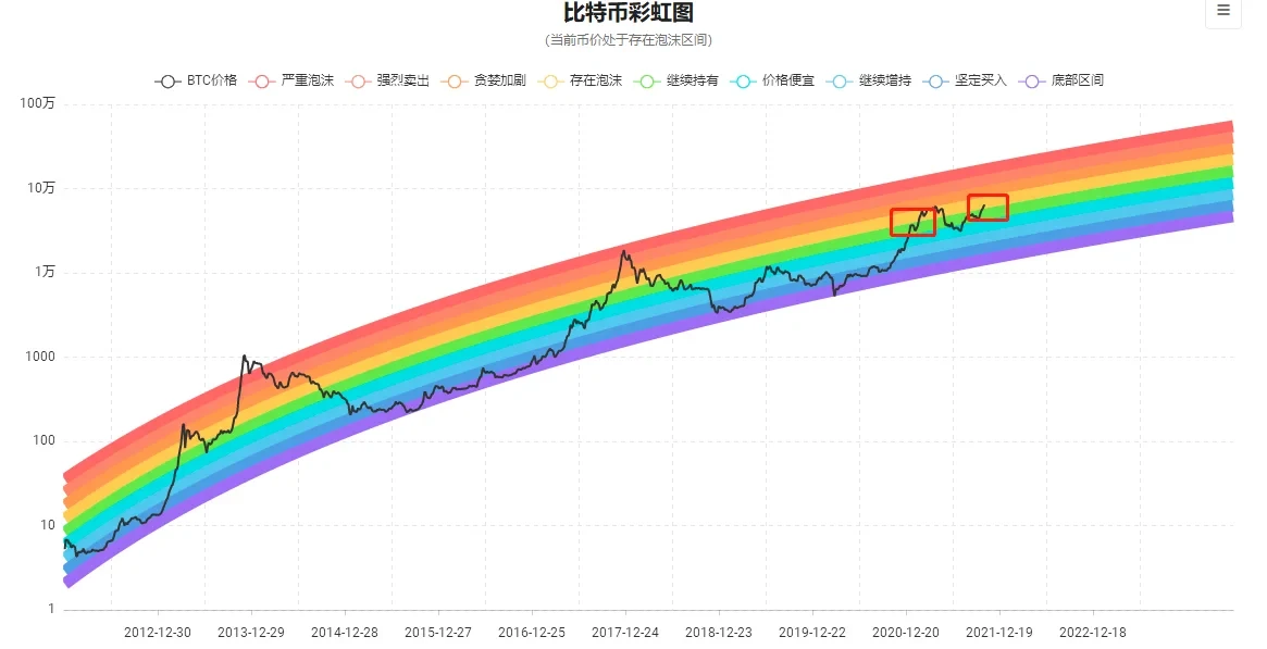 第二个,比特币彩虹图。现在刚从“继续持有”区域进入“存在泡沫”区域,最近一次出现这种情况是在今年1月份,当时的比特币出现了大幅回调再继续上涨创新高的行情。如果放宽时间,前两次比特币减半行情是在进入或超过“严重泡沫”区域之后,牛市才真正的到顶。