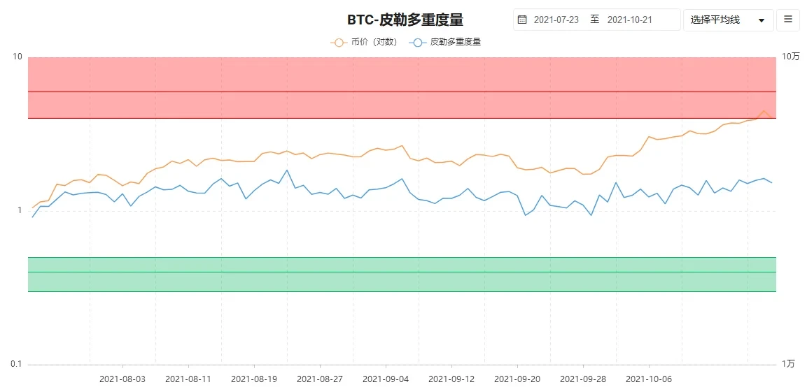 第三个,Puell Multiple指标(皮勒多重度量)。目前数值是1.52,目前的数据还处在相对的安全区间内:大于1时,说明当日矿工采矿获利能力优于近一年平均收益;而一段时期内处于4-10.5,说明目前市场情绪较为贪婪,可能处于牛尾阶段。而从比特币全网算力来看,自7月初开始一直在持续增加,从低点68E增长到10月份最高163E,虽然算力的增加与比特币价格并没有绝对的正相关关系,但是这也代表了比特币矿工对于后市的乐观情绪。