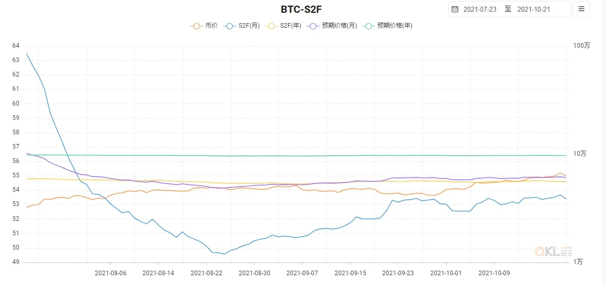 第一个:S2F模型。该指标通过BTC存量与增量的比值衡量BTC的稀缺性。此指标因为其创建人Plan B连续预测对比特币近期的价格而声名鹊起:在今年6月20日,Plan B基于改良后新的S2F模型预测了2021年比特币每个月的收盘价格:8月>47k,9月>43k,10月>63k,11月>98k,12月>135k。其中8月、9月都已精准到位,10月份的比特币价格目前也已到达,但是,在今年6月,他的S2F模型也被证实失效过。