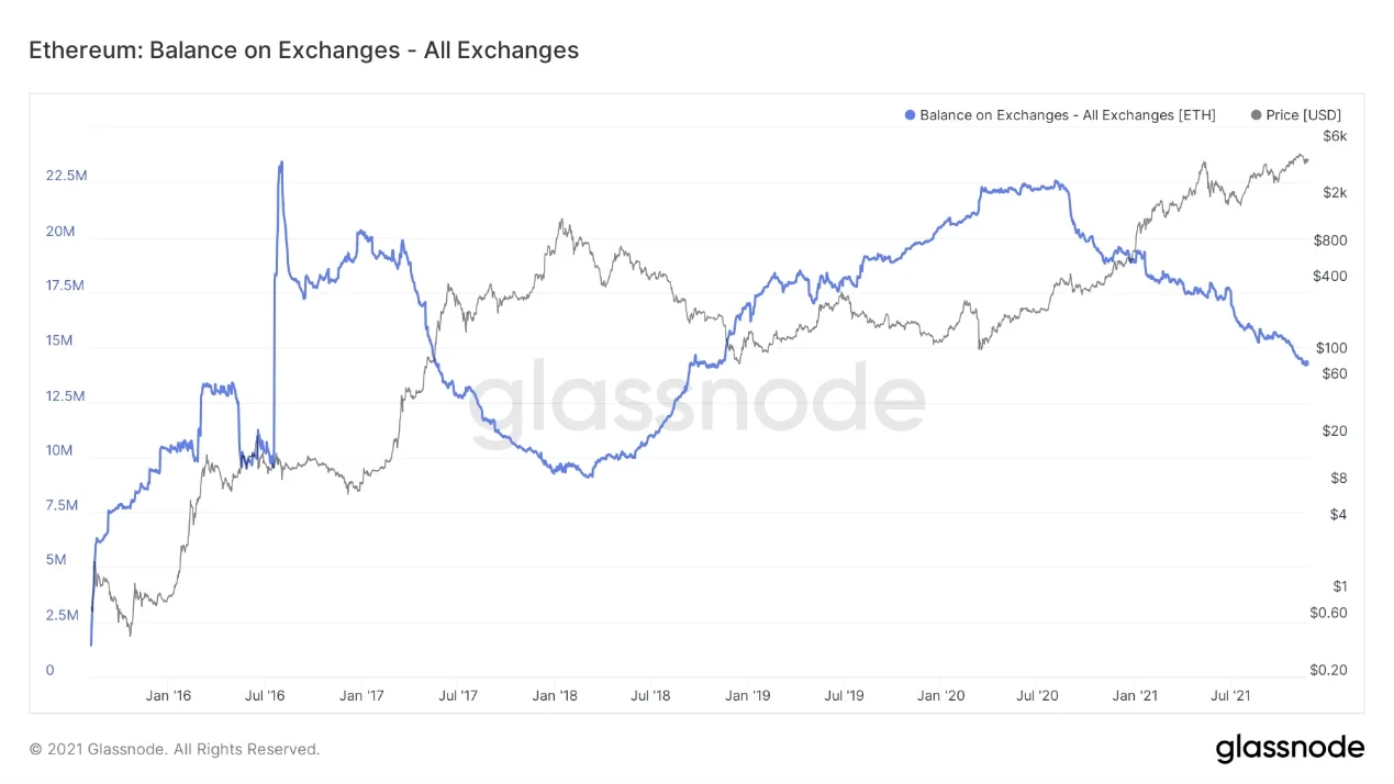 最后再让我们把视线拉回到当下,我们知道,对市场内大多数投资者来说,将资产转入欧易等交易平台是最常见的出售方式。所以从交易平台地址上以太坊的数量的变化,大致可以了解投资者出售意愿的强弱变化。通过glassnode的统计信息可以看出,自从2020年4月中旬以来,交易平台地址中ETH的数量占总流通量的比例呈现出一路下降的趋势,虽然在今年5月~7月间有小幅上涨,但是很快便再次重回下行区间,目前交易平台地址上的以太坊数量已经从2020年4月中旬最高2251万枚降至1418万枚左右,即便不考虑在此期间的新增发行量,在过去19个月间,交易平台地址上,净减少的以太坊数量也超过了37%,这种情况可以解读为投资者将自己所持有的以太坊转至独立钱包、DeFi智能合约或者ETH2.0质押之中,当然以太坊矿工的地址也是值得关注的一个重要目标。