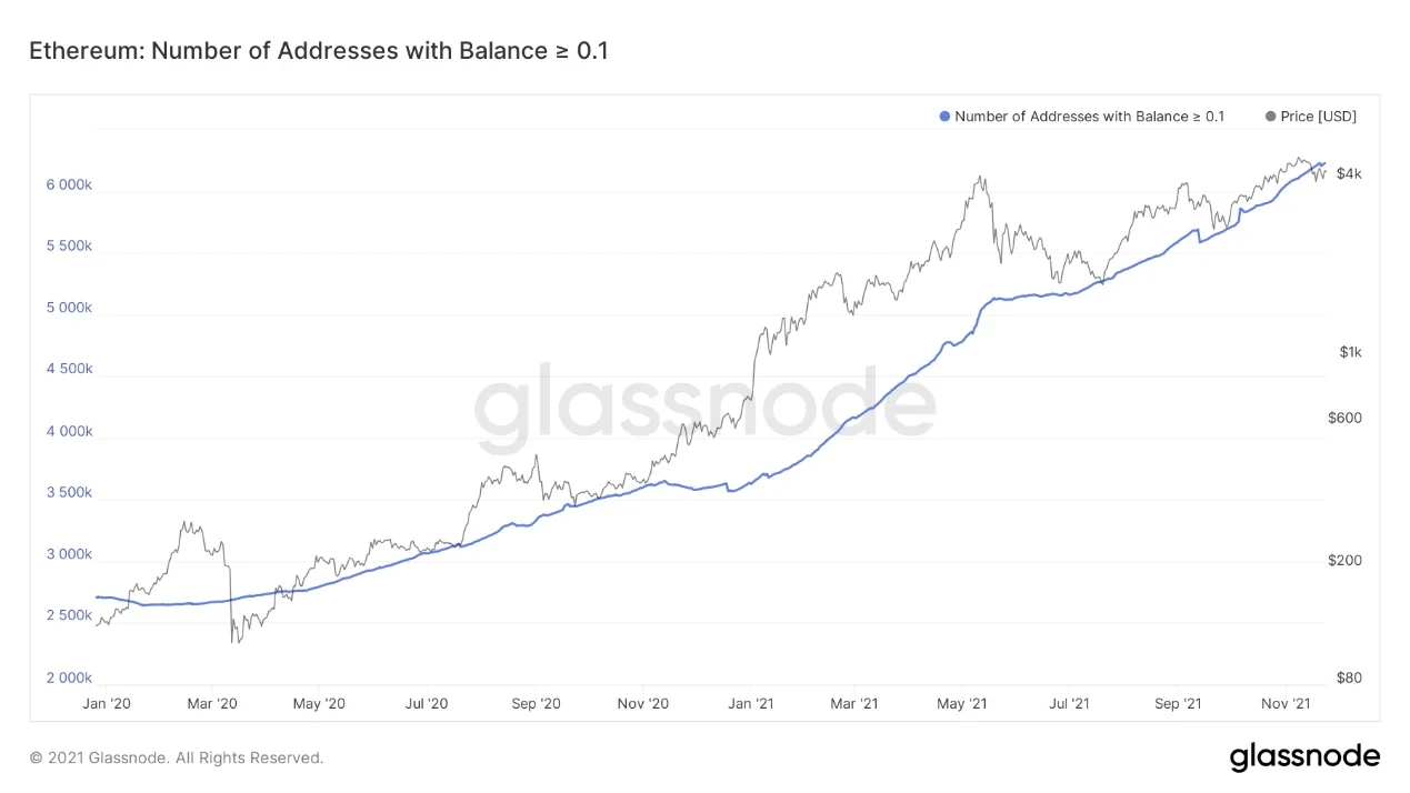 据glassnode数据,截至11月24日,持仓超过0.1枚ETH的地址数已经超过620万个,达到625万,创下历史新高。