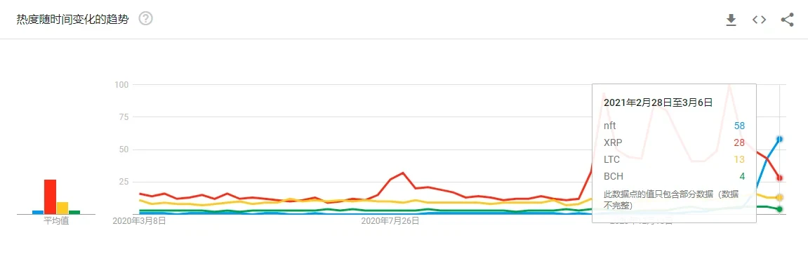 虽然NFT的市值规模较小,但行业活跃度越来越高。谷歌数据显示,NFT相关搜索量已经超过了LTC、BCH和XRP,再加上越来越多的名人、高净值收藏家、机构等入场参与NFT,NFT成了圈内继DeFi外,抱以厚望的发展方向之一。