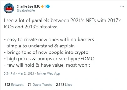 3月2日,莱特币创始人李启威发推称,2021年的NFT与2017年的ICO、2013年的山寨币之间有颇多相似之处:项目创建无障碍,易于理解和解释,能带来大量的流量,不断拉高的价格形成炒作/FOMO,大多数没什么价值。