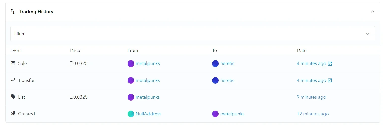 OpenSea的页面最下方还可以看到作品自诞生以来进行的每次操作和版权变更。