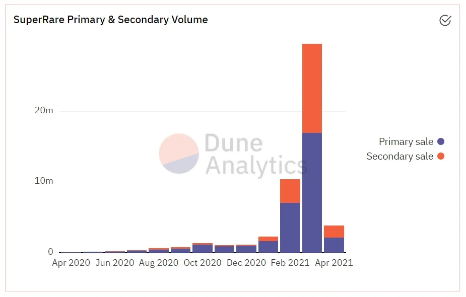 从Dune Analytics的图表看出,以SuperRare为例,二级市场正在快速发展。2021年2月的时候,初级销售为708.25万美元,二级销售为329.93万美元,二级销售占总销售的比重为31.78%,到了3月,初级销售为1695.95万美元,二级销售为1261万美元,二级销售的比重上升到了42.65%。