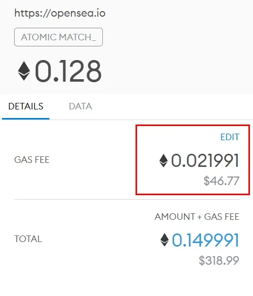 链上手续费较为昂贵,Gas费需要46.77美元。