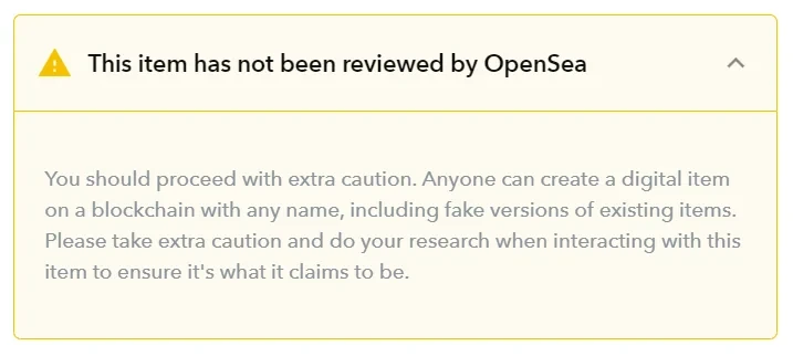 比如我们刚刚在OpenSea上下单NFT产品,就有收到如下提示。这是因为OpenSea不设门槛,任何人都可以用任何名字在区块链上创建数字物品,甚至是创建现存物品的假冒版本。